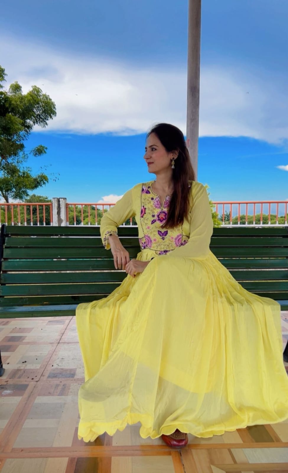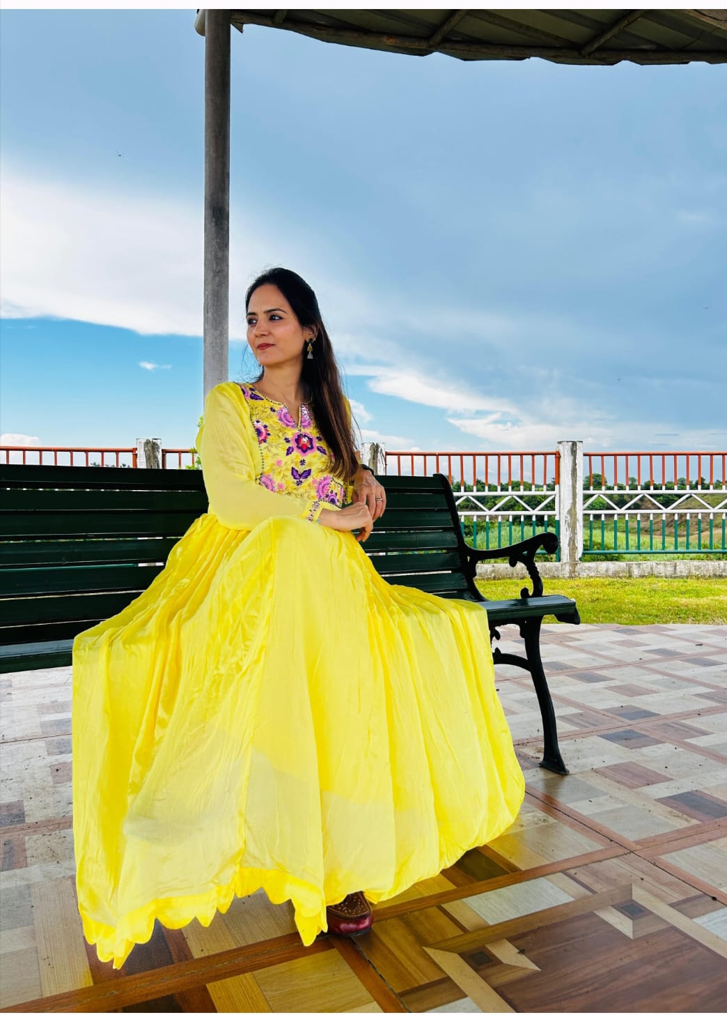 This graceful yellow Anarkali is crafted in premium *Chinon fabric, offering a soft, flowy drape. Designed with a **medium tie-and-dye effect, it features a beautifully flared silhouette that moves effortlessly. The highlight of the outfit is the **hand embroidery on the yoke and sleeves*, adding a rich handcrafted touch and elegant detailing.